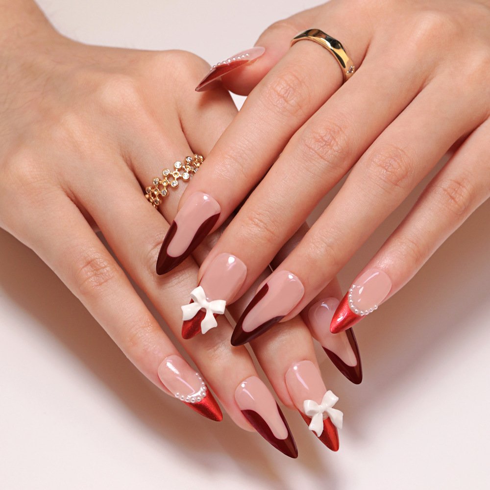 Elegant 3D Bow Press-On Nails: Red Almond Shape Manicure for Special Occasions