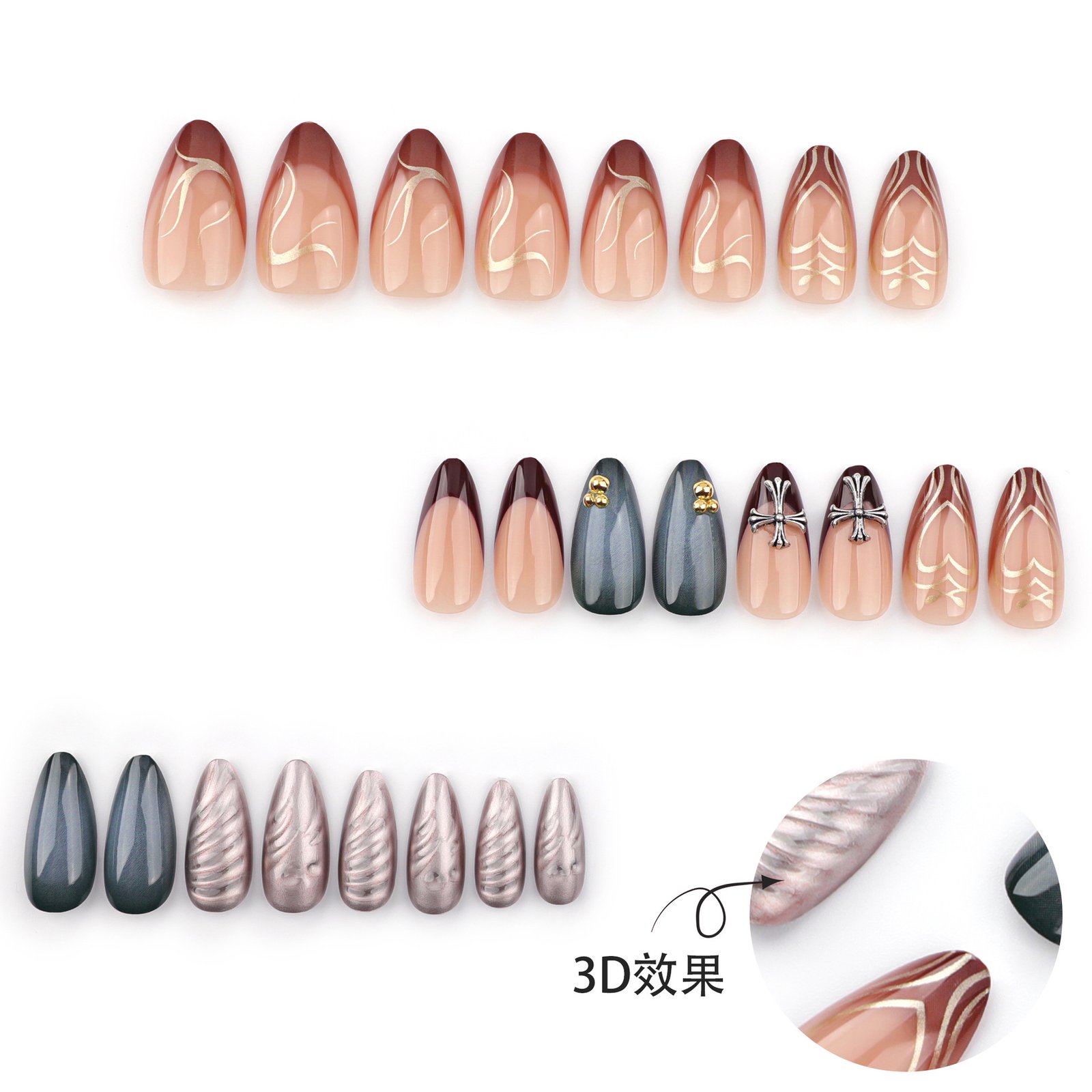 Maillard Style Press-On Nails: 3D Cross Designs with Gold Accents for Fall/Winter Elegance